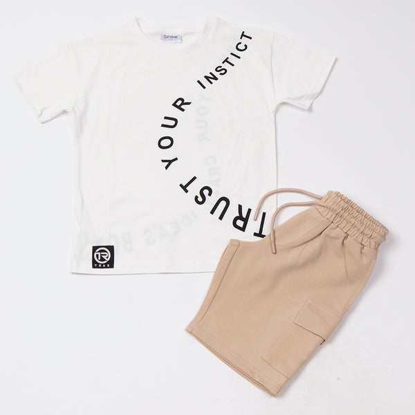 ΚΑΛΟΚΑΙΡΙΝΟ ΣΕΤ TRAX ΓΙΑ ΑΓΟΡΙΑ 7-16 ΕΤΩΝ  Κοντομάνικη μπλούζα με τύπωμα και μακό βερμούδα με μαλακό λάστιχο στην μέση.