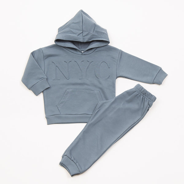 Παιδική φόρμα σετ TRAX για αγόρια από 2 έως 6 ετών. Μακρυμάνικη φούτερ μπλούζα με κουκούλα και NYC τύπωμα. Φούτερ παντελόνι φόρμας με μαλακό λάστιχο στη μέση και στον αστράγαλο.