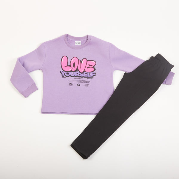 Χειμερινό σετ TRAX για κορίτσια από 7 έως 12 ετών. Μακρυμάνικη μπλούζα φούτερ με όμορφο τύπωμα και μονόχρωμο μάυρο κολάν με εσωτερικό χνούδι και μαλακό λάστιχο στη μέση.